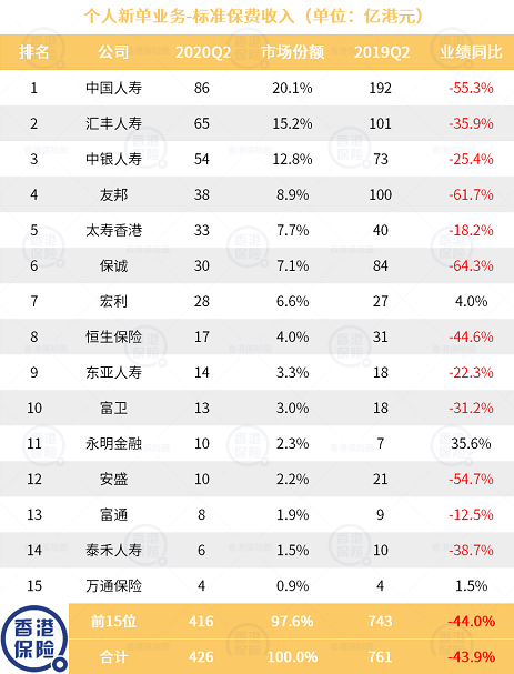 依賴內地訪客業務的英國保誠從去年的第4 名到第7名。其實像英國保誠、友邦、中國人壽等公司,深耕內地客戶市場,在港險拔得頭籌。但巧婦難為無米之炊,香港不開關,內地客戶沒有投保機會,因此才遭遇如此大的衝擊。