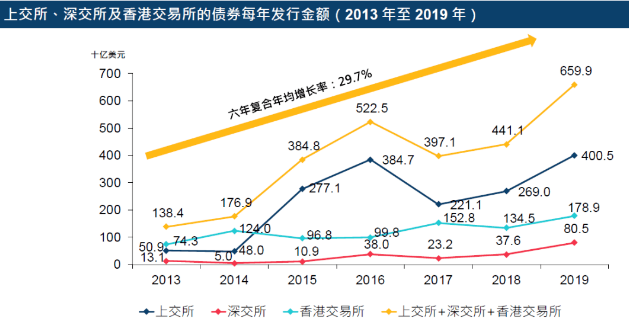 香港上市債券的總餘額於過去十年大幅增長,由2009年的3,920億港元增至2019年的52,050億港元,十年之間的複合年均增長率達29.5%,這可部份歸因於內地、香港及海外發行人自2010年起紛紛於香港發行離岸人民幣債券(即「點心債」)。另外,美元債券發行量的增加,尤其是內地房地產公司發行的美元債券,亦推動這增長。
