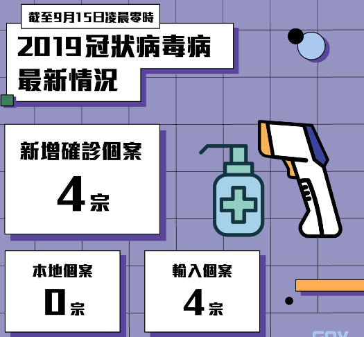 好消息!香港衛生防護中心公佈,截至9月15日零時零分,香港新增4宗確診個案,均屬外地輸入案例,本地個案零確診~也是第三波疫情至今首次本地零感染。