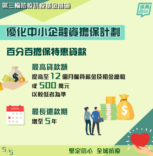 中小企融資擔保計畫亦有加碼,旗下的百分百擔保特惠貸款,最高貸款額由6個月提高至12個月僱員薪金及租金總和,或最高金額由400萬增至500萬元,以較低者為准。最長還款期亦由3年增至5年。