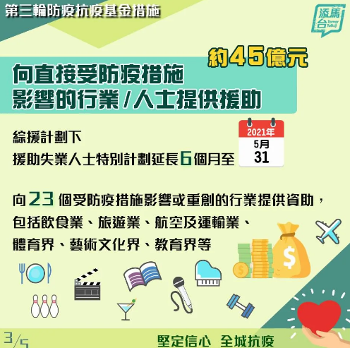 第三輪基金動用約45億元,資助受影響人士及焦點企業,包括綜援計畫的援助失業人士特別計畫,延長6個月至2021年5月31日。