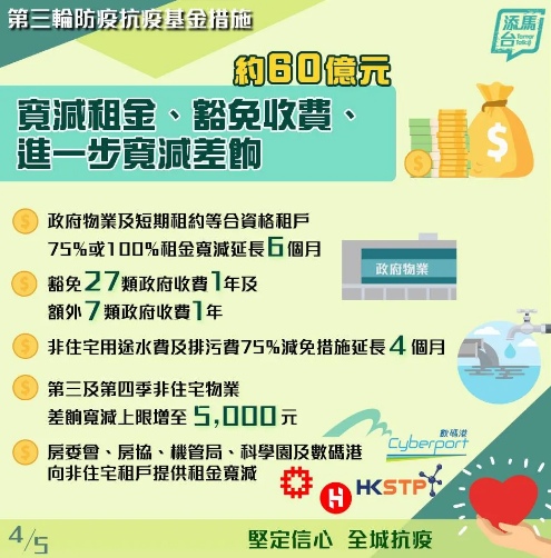 3、約60億元用以寬減/寬免租金、豁免政府收費和進一步寬減差餉