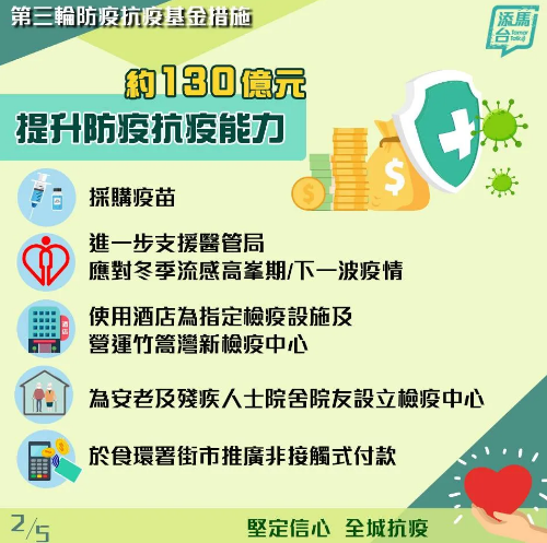 新型冠狀病毒疫情對香港帶來前所未有的挑戰,香港特區政府因應市民和社會的需要,作出了史無前例的回應。香港行政長官林鄭月娥15日下午3時半公佈第三輪防疫抗疫基金。港府將推出第三輪240億元的防疫抗疫基金,協助受疫情影響的企業和市民,以及提升香港的防疫抗疫能力。主要用於一下方面: