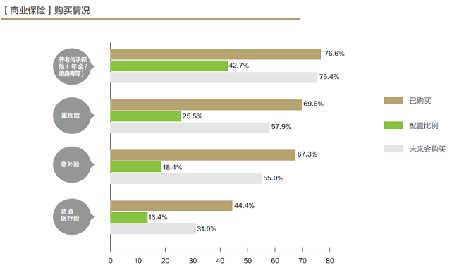 在已購保險類型中,高淨值人群在養老傳承保險購買比例最高,且配置比例接近一半。此外,重疾險,意外險購買比例也較高,其中重疾險的配比約占到總保險配置的四分之一,表明高淨值人群配置險種較為豐富。