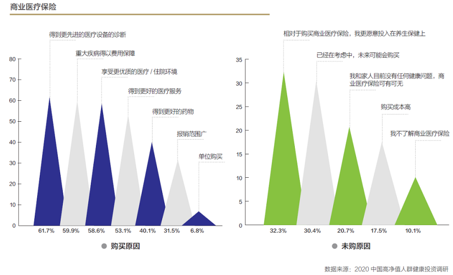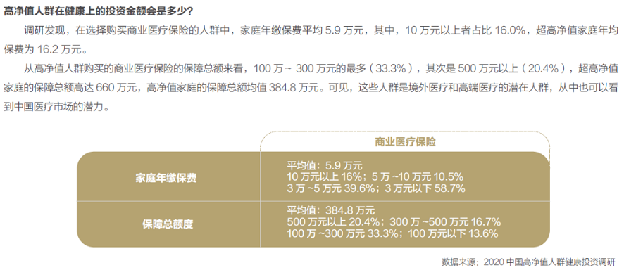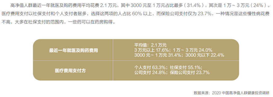 高淨值人群希望獲得更好的醫療條件,而高端醫療保險突破了醫院以及用藥的指定範疇,使得高淨值人群能夠根據自己的需求,在特需門診、國際醫療部、私立醫院等高端醫療機構就診,並能享有其他高端增值醫療服務。