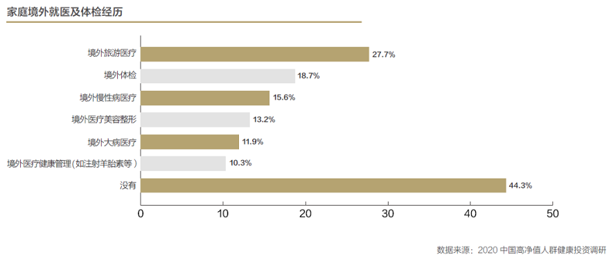 11.6% 的高淨值人群會在不滿意醫療的情況下選擇境外就醫,表明境外醫療成為部分高淨值人群醫療選擇的重要補充管道。實際上,過半高淨值人群已有境外就醫及體檢經歷。