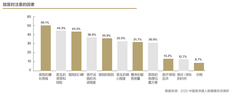 高淨值人群在選擇醫院時主要考慮醫院的擅長領域,醫生資質和經驗以及醫院口碑。但有31.7%對整體服務品質有要求。