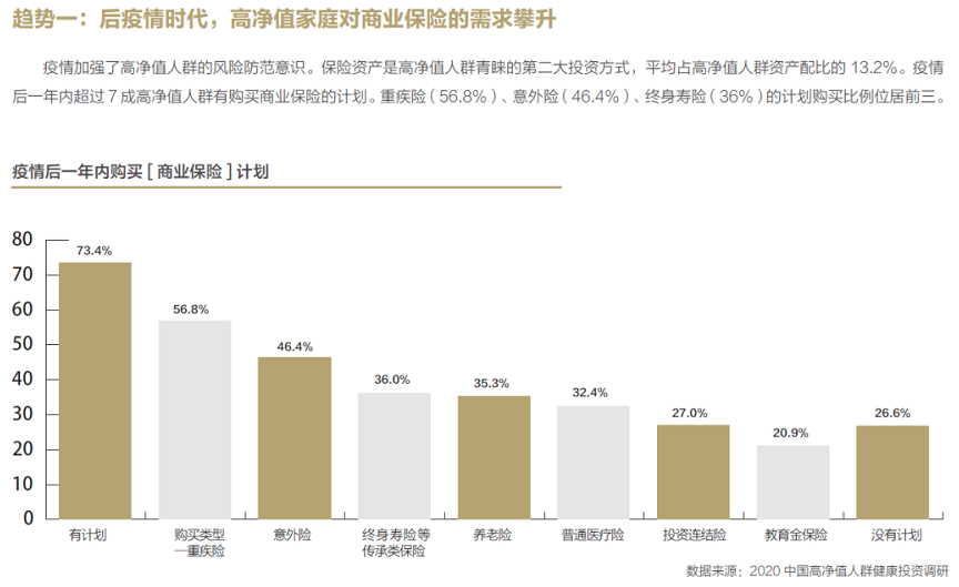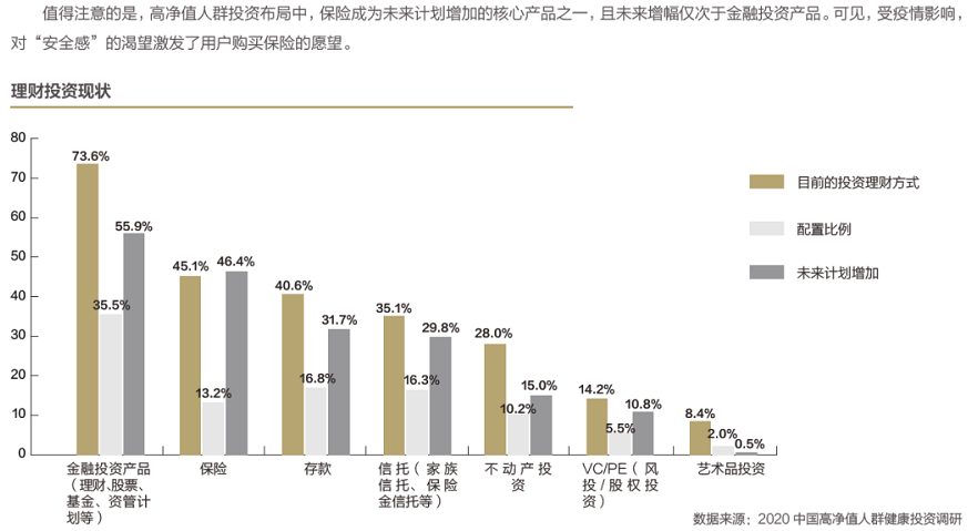 高淨值人群投資佈局中,保險成為未來計畫增加的核心產品之一,且未來增幅僅次於金融投資產品。可見,受疫情影響,對“安全感”的渴望激發了用戶購買保險的願望。