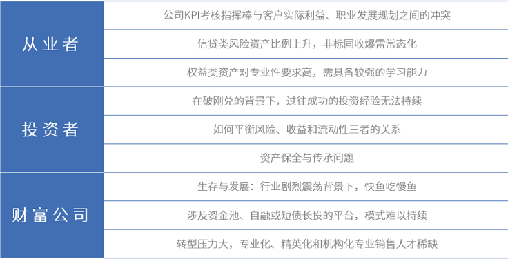 在資產回報下降、風險上升的金融出清大背景下,風險爆雷從過去的星星點點到如今的星火燎原,集中釋放;而處在轉折期的財富管理行業參與者焦慮特徵明顯,不論是從業者、投資者和財富機構,各有焦慮。