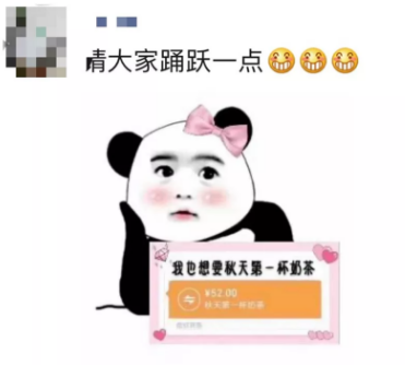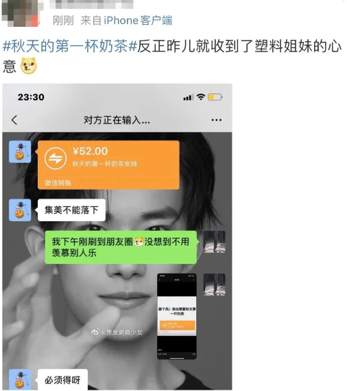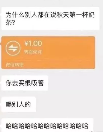 1、就是借著秋天來了要了杯奶茶的紅包,定義為秋天第一杯奶茶來秀恩愛。