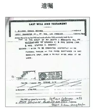 1992年,張愛玲在洛杉磯市立了一份遺囑,內容有三:
