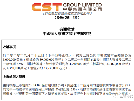 週一,中譽集團在港交所發佈的公告稱,2020年9月25日(下午四時後),已於公開市場收購本金總額各為500萬美元(約3900萬港元)的2021年到期6.25%中國恒大票據及2021年到期8.9%中國恒大票據,總代價分別約為429萬美元(約3346萬港元)及435萬美元(約3393萬港元)。