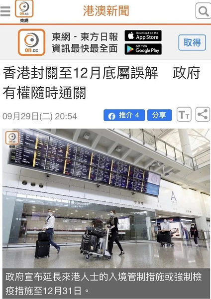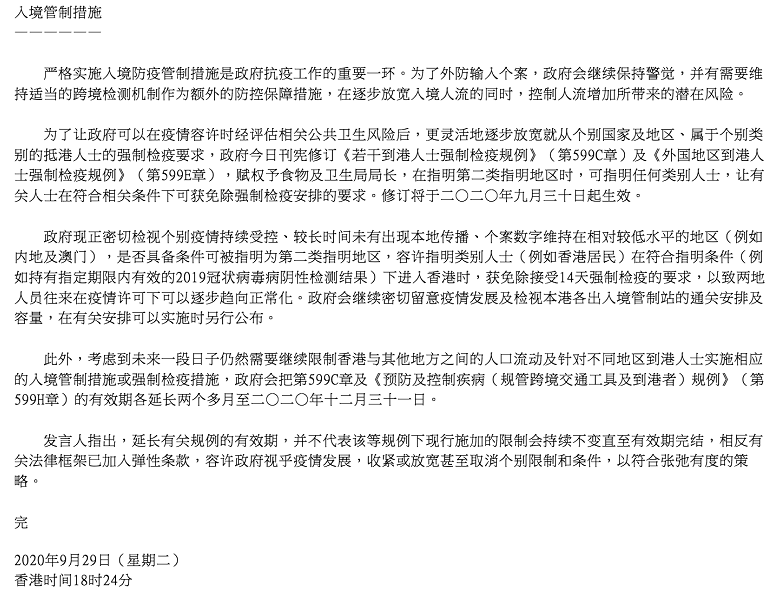 9月29日,港府宣佈,將《若干到港人士強制檢疫規例》(第599C章)的有效期延長至2020年12月31日。