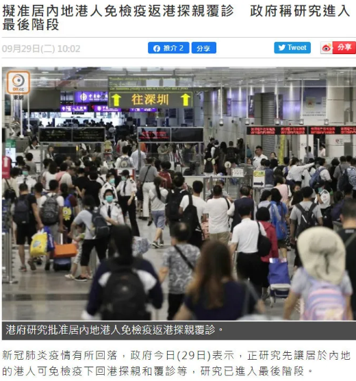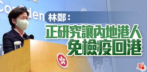 香港特首林鄭月娥指出:政府會逐步恢復中港兩地人員往來,已積極和內地跟進,通過檢測結果可以豁免十四日強制檢疫,希望中港澳三地往還正常化。