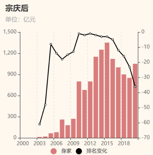 在2010年、2012年,宗慶後兩次登頂中國首富之位。尤其在2012年,淨資產達到100億美元。