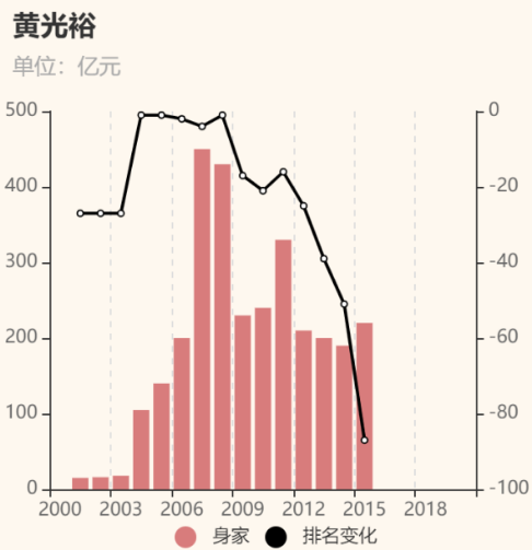 2004年,35歲的黃光裕通過借殼上市的方式在香港上市,個人資產突破百億,首次摘得胡潤百富榜榜首。同樣因為股市,2008年黃光裕因非法經營,內幕交易以及單位行賄罪被拘,從榜單前100名中逐漸淡出。