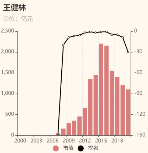 王健林在2012-2016年期間,也曾三度摘得首富桂冠。但2016年也成為轉捩點,從這年起,王健林家族身家開始下滑。在新公佈的胡潤百富榜中,王健林及其家族以1190億人民幣的資產排名30位,絕對值甚至不及2013年水準。