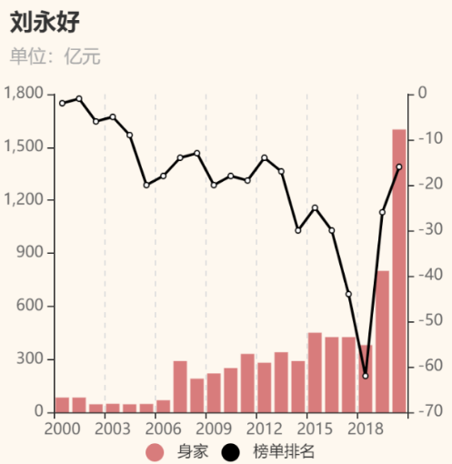 第二位登頂者劉永好、劉永行家族。1995年,劉永行四兄弟進行資產重組,老二劉永行成立東方希望集團,而老四劉永好成立新希望集團,各自在相關領域發展。
