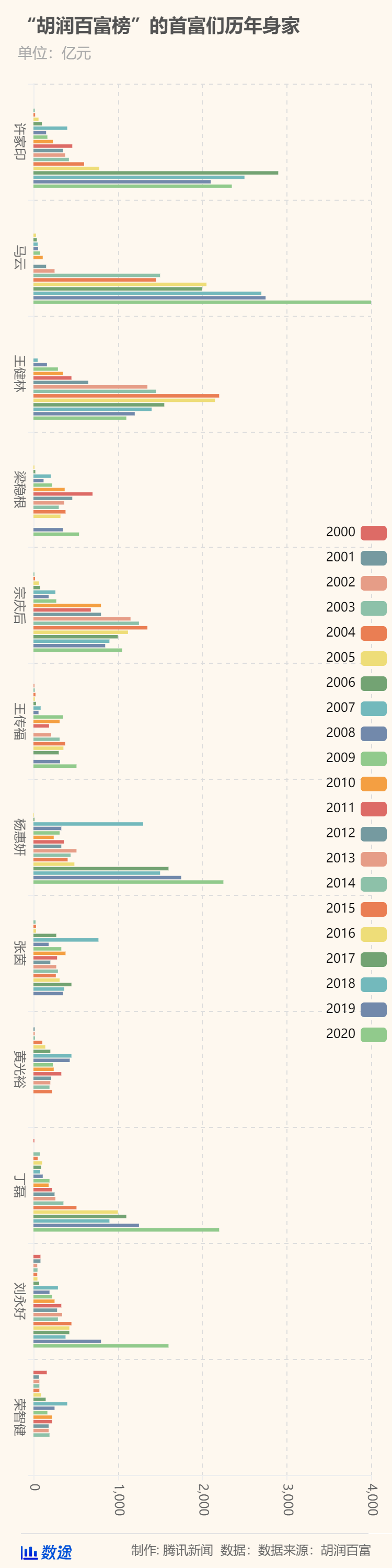 從下邊的圖中,可以更直觀的展示看出這13位首富身家的變化。
