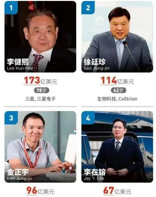 7月9日,福布斯發佈2020年韓國富豪榜顯示,三星會長李健熙財富居首,達173億美元(約合1156億元人民幣);其兒子,即三星副會長李在镕財富為67億美元,位列第四。