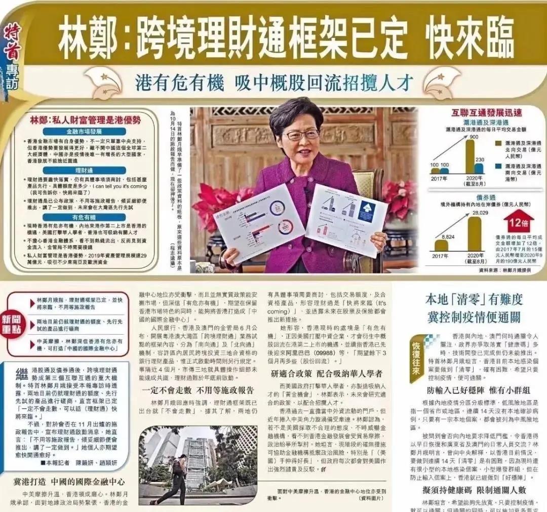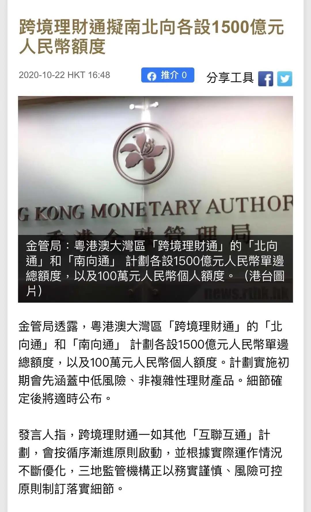 香港特區行政長官林鄭月娥表示,粵港澳大灣區的“跨境理財通”已設定相關框架,並且快將來臨。金管局表示,“南向通”及“北向通”均擬各設1500億元(人民幣.下同)單邊總額度,以及100萬元的個人額度。計畫實施初期會先涵蓋中低風險、非複雜性理財產品。
