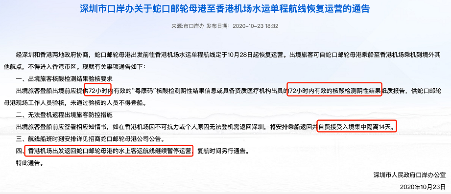 經深圳和香港兩地政府協商,深圳蛇口郵輪母港出發前往香港機場水運單程航線定於10月28日起恢復運營。出境旅客可自蛇口郵輪母港乘船至香港機場乘機到境外其他航點,不得進入香港市區。(香港機場海天碼頭位於口岸禁區,即不屬於入境香港的區域)