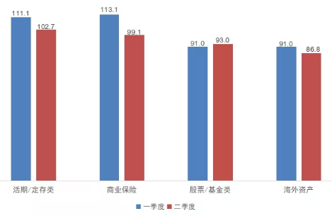 1.家庭更偏好活期、定存類以及商業保險類等低風險資產,而由於海外疫情持續未得到有效控制,家庭對海外資產的配置意願持續降低。