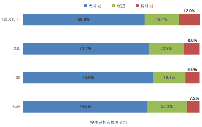在二季度我們詢問了家庭在下一季度的購房計畫,從不同房屋持有狀況的家庭來看,在每個細分群體中,七成左右的家庭是沒有購房計畫的。但多套房家庭的住房投資意願仍然較高,擁有三套及以上住房的家庭,計畫購房的比例為12%。