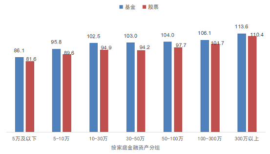 我們把家庭按照持有的金融資產進行分組後發現,不論持有金融資產高低,家庭的基金投資意願指數均高於股票投資意願指數。