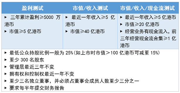 企業想在港交所上市,必須得提供足夠的財務資訊給港交所審核。例如,想要在港交所主板上市,需要通過港交所的三套財務測試(盈利測試、市值/收入測試、市值/收入/現金流測試)標準中的至少一個: