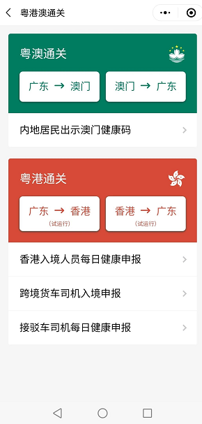 廣東省政府微信小程式“粵省事”昨日新增“粵港通關(試運行)”選項,包括“廣東往香港(試運行)”、“香港往廣東區(試運行)”,並設有三項申報類別,包括“香港入境人員每日健康申報”、“跨境貨車司機入境申報”、“接駁車司機每日健康申報”。