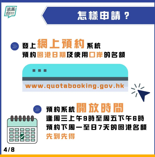 有關「回港易」網頁預約由11月18日起開始,申請需要提供身份證號碼,一個申請人取多可以為3位同行人士,只可以經深圳灣口岸,名額3000人/天、港珠澳大橋名額2000人/天,系統會即時顯示成功,以及手機會收到確認短訊。