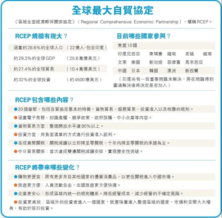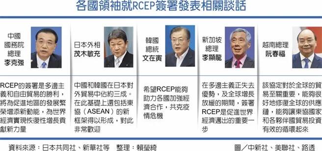 當天,RCEP各成員國發表聯合聲明指,協定對建立開放及框架性貿易和投資系統,擺脫疫情危機具有重大意義。各國領導人會儘早完成相關程式、爭取協定早日生效。