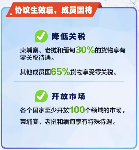 財政部表示,RCEP協定貨物貿易自由化成果豐碩。各成員之間關稅減讓以立即降至零關稅、十年內降至零關稅的承諾為主,自貿區有望在較短時間內取得重大階段性建設成果。中國和日本首次達成了雙邊關稅減讓安排,實現了歷史性突破。協定有利於推動實現區域內高水準的貿易自由化。