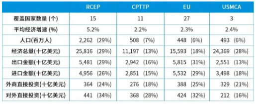 近5年,RCEP區域平均經濟增速達到5.2%,遠超CPTPP (2.2%)、EU(2.3%)和USMCA(2.4%)的增速,也快於全球平均3.4%的經濟增速。
