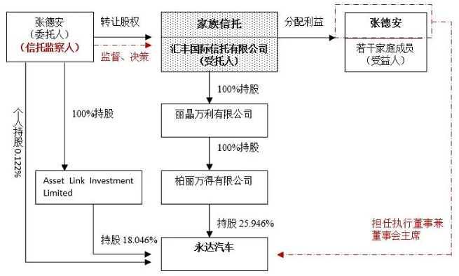 【操作模式】2012年4月,Asset LinkInvestment Limited(張德安全資控制的公司)將其持有永達汽車的部分股份(約30%),無償贈與給柏麗萬得有限公司——該公司由麗晶萬利有限公司全資擁有。2012年4月5日,張德安成立家族信託,將其全資持有的麗晶萬利有限公司的股份,全部轉讓給受託人匯豐國際信託有限公司,張德安及其家庭成員作為受益人。為了確保受託人遵照信託條款並為受益人的利益服務,張德安擔任該家族信託的監察人,即時監督受託人的信託管理行為。