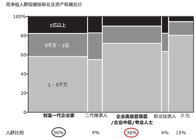 根據《2019財富報告》,在高淨值人群中,企業主占非常高的比例,且其身價上億的比例最高。其中,創富一代企業家與企業中高層(包括高級管理層、企業中層及專業人士)分別占比36%。