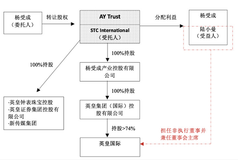 楊受成是香港知名的企業家,以經營鐘錶發家致富,其後涉足房地產、娛樂、金融等領域。英皇集團(國際)有限公司(簡稱英皇國際)是楊受成控制並在香港證券交易所上市的企業。楊受成對該公司及整個企業集團的控制,主要是借助股權信託的架構。根據英皇國際歷年的中期報告和年度報告,其股權信託結構如下: