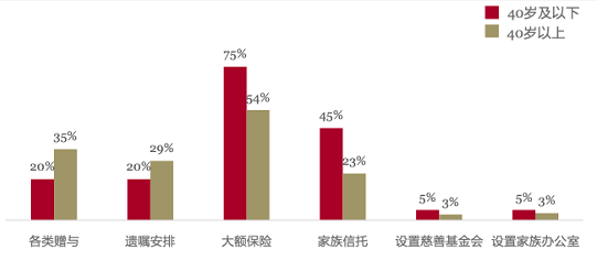 年齡與家族資產規模會顯著影響企業家對傳承工具的選擇偏好。相較於40歲以下的企業家群體,更為年長的企業家偏好通過各類贈與和遺囑安排進行家族財富傳承,而年輕企業家群體對大額保險、家族信託、家族辦公室等傳承方式的接受程度則相對較高,家族信託及家族辦公室在未來有廣闊的發展空間。