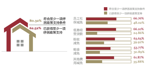 ※疫情下紓困政策雪中送炭,幫助企業走出困境:在政府提供的各項紓困政策中,80.32%的本次受訪企業符合至少一項紓困政策支持條件,其中約62.52%的受訪企業家表示自己所經營的企業已獲得至少一項紓困政策的支持。紓困政策覆蓋廣泛,支持企業復工複產。