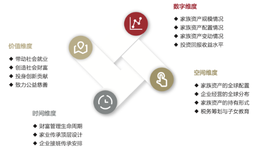 為了更好地瞭解中國企業家群體的家族財富管理需求,近日,中國銀行私人銀行發佈《中國企業家家族財富管理白皮書》,中行私人銀行結合多年實踐經驗,提出“財富四維度模型”,從數字、空間、時間、價值四個維度梳理家族財富特徵,為企業家的家族財富、企業財富和社會財富提供了一個多元全面、豐富立體的分析框架。