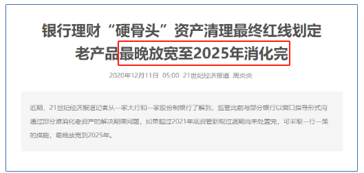 銀行理財資產清理原先延期一年到2021年底,但現在有消息稱,老產品最晚消化時間寬限到2025年。
