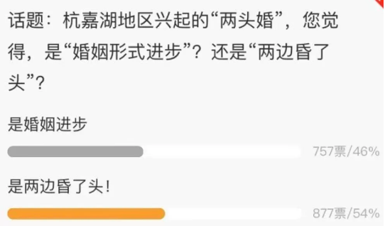 有媒體也就這個問題做了投票,對於兩頭婚是“婚姻的進步”,還是“兩邊昏了頭”,網友們進行了激烈的討論