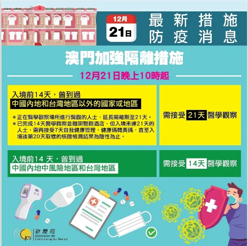 新型冠狀病毒感染應變協調中心(12月21日)晚上9時舉行緊急記者會,宣佈過去14天內曾到過中國內地及臺灣地區以外的國家或地區(包括英國和香港等)者,入境本澳隔離醫學觀察期由14天增至21天,包括未完成隔離醫學觀察及該措施生效後入境者。