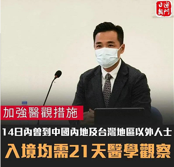 過去14天若去過內地及臺灣地區以外的國家及地區,包括香港及英國,自措施生效後才入境澳門,或正接受醫學觀察的人士,統一要接受21天醫學隔離觀察。