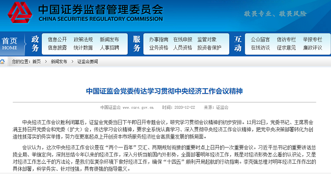 會議強調,明年是“十四五”開局之年,做好明年資本市場工作十分重要。證監會系統要堅持以習近平新時代中國特色社會主義思想為指導,全面貫徹黨的十九屆五中全會精神和中央經濟工作會議精神,立足新發展階段,貫徹新發展理念,服務新發展格局,堅持穩中求進工作總基調,堅持系統觀念,堅持“建制度、不干預、零容忍”,加強資本市場基礎制度建設,穩步提高直接融資比重,著力增強資本市場樞紐功能,為推動經濟高質量發展積極貢獻力量。