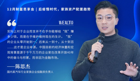 但這對於機構來說就毫無參考意義了嗎?並非如此。首先,高淨值客戶-企業-企業主,這幾方面互相成就,也對應了他的財富、社會地位、市場口碑及影響力,所以這些是劃等號的東西,財富管理機構服務的是一個綜合個體,而非一個“帳戶”的概念,高淨值客戶的財富管理服務勢必是多元及複雜的。其次,家族及其企業仍然面臨諸如新冠疫情等外部突發事件、交班傳承等問題。陳思傑先生另外提到了家族企業內嵌型家辦的角色作用,如家族財富顧問,包括承擔家族辦公室的主要業務(即財富規劃、策略、風控、治理),以及公司內部治理,同時也包括公司資產和家庭資產內部治理的分析。“而這個分析是外部金融機構做不了的,也很難去達到企業主的心意。”