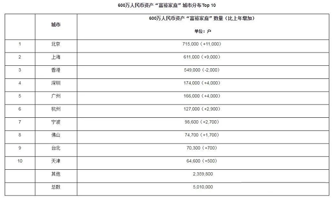 北京依然是擁有最多600萬人民幣資產“富裕家庭”的地區,比上年增加1.1萬戶,達到71.5萬戶,增幅1.6%,其中擁有600萬人民幣可投資資產的“富裕家庭”數量有26.8萬戶;廣東第二,600萬人民幣資產“富裕家庭”比上年增加1.3萬戶,達到69.2萬戶,增幅1.9%,其中擁有600萬人民幣可投資資產的“富裕家庭”數量有25.6萬戶;上海第三,600萬人民幣資產“富裕家庭”比上年增加9.000戶,達到61.1萬戶,增幅1.5%,其中擁有600萬人民幣可投資資產的“富裕家庭”數量有21.4萬戶;香港第四,600萬人民幣資產“富裕家庭”比上年減少2.000戶,達到54.9萬戶,降幅0.4%,其中擁有600萬人民幣可投資資產的“富裕家庭”數量有19.3萬戶;浙江第五,600萬人民幣資產“富裕家庭”比上年增加9.000戶,達到52.5萬戶,增幅1.7%,其中擁有600萬人民幣可投資資產的“富裕家庭”數量有18.5萬戶。
