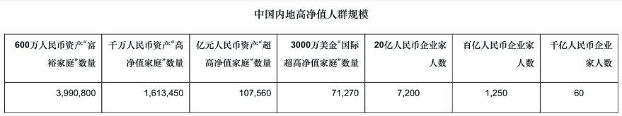 注:報告中的“富裕家庭”為600萬人民幣資產家庭,“高淨值家庭”為千萬人民幣資產家庭,“超高淨值家庭”為億元人民幣資產家庭,“國際超高淨值家庭”為3000萬美金資產家庭。以為數據為“ 擁有資產”,並非“可投資資產”。