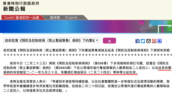 政府今日(二月二十三日)將就《預防及控制疾病條例》(第599章)下多項規例的修訂刊憲,放寬在《預防及控制疾病(禁止群組聚集)規例》(第599G章)下在公眾場所進行群組聚集的人數限制由二人至四人;以及延長有關規例的有效期至二○二一年九月三十日。有關修訂將由明日(二月二十四日)零時零分起生效。